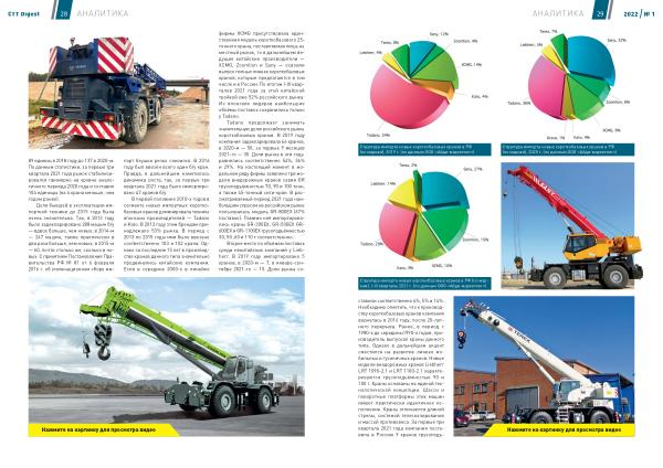 ставили соответственно 4 %, 5 % и 14 %. Необходимо отметить , что к производству короткобазовых кранов компания вернулась в 2016 году , после 20-летнего перерыва . Ранее , в период с 1980-х до середины1990-х годов , производитель выпускал краны данного типа . Однако в дальнейшем акцент сместился на развитие линеек мобильных и гусеничных кранов . Новые модели внедорожных кранов Liebherr LRT 1090-2.1 и LRT 1100-2.1 характеризуются грузоподъёмностью 90 и 100 т . Краны основаны на единой технологической концепции . Шасси и поворотные платформы этих машин имеют практически идентичное исполнение . Краны отличаются длиной стрелы , системой телескопирования и массой противовеса . За первые три квартала 2021 года компания поставила в Россию 9 кранов грузоподъ-