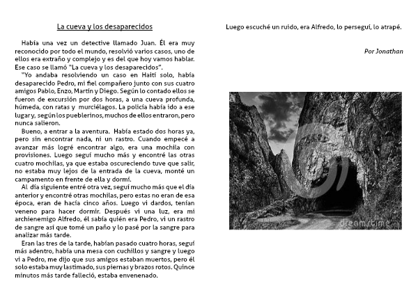 “Yo andaba resolviendo un caso en Haití solo, había desaparecido Pedro, mi fiel compañero junto con sus cuatro amigos Pablo, Enzo, Martín y Diego. Según lo contado ellos se fueron de excursión por dos horas, a una cueva profunda, húmeda, con ratas y murciélagos. La policía había ido a ese lugar y, según los pueblerinos, muchos de ellos entraron, pero nunca salieron.