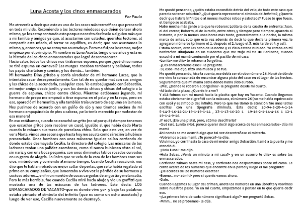 Me atrevería a decir que este es uno de los casos más terroríficos que presencié en toda mi vida. Recomiendo a los lectores miedosos que dejen de leer ahora mismo, yo les estoy contando esto porque necesito decírselo a alguien más que a mi familia y amigos ya que, al asustarme con ustedes, queridos lectores, al compartir este miedo, el terror se equilibra, es decir, que nos asustamos lo mismo, y, entonces, ya no estoy tan asustada yo. Pero me fui por las ramas, mejor empiezo por el principio. Mi nombre es Luna Acosta, tengo once años y esta es la historia de los cinco enmascarados que logré desenmascarar.