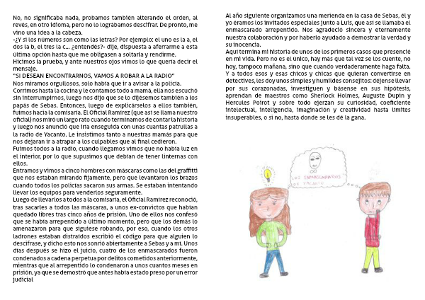 Aquí termina mi historia de unos de los primeros casos que presencié en mi vida. Pero no es el único, hay más que tal vez se los cuente, no hoy, tampoco mañana, sino que cuando verdaderamente haga falta. Y a todos esos y esas chicos y chicas que quieran convertirse en detectives, les doy unos simples y humildes consejitos: déjense llevar por sus corazonadas, investiguen y básense en sus hipótesis, aprendan de maestros como Sherlock Holmes, Auguste Dupin y Hercules Poirot y sobre todo ejerzan su curiosidad, coeficiente intelectual, inteligencia, imaginación y creatividad hasta límites insuperables, o si no, hasta donde se les dé la gana.