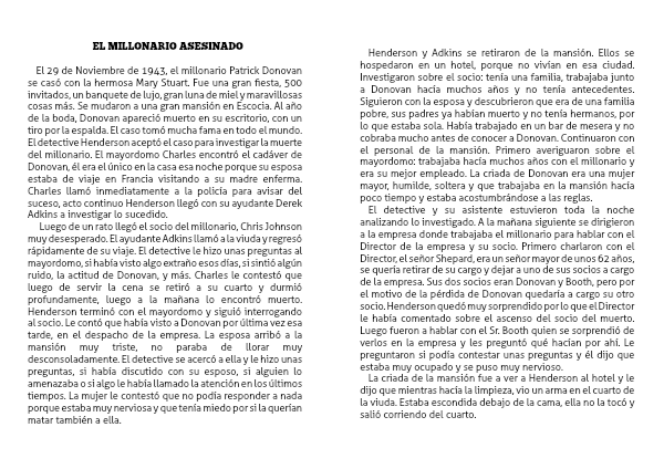 El detective y su asistente estuvieron toda la noche analizando lo investigado. A la mañana siguiente se dirigieron a la empresa donde trabajaba el millonario para hablar con el Director de la empresa y su socio. Primero charlaron con el Director, el señor Shepard, era un señor mayor de unos 62 años, se quería retirar de su cargo y dejar a uno de sus socios a cargo de la empresa. Sus dos socios eran Donovan y Booth, pero por el motivo de la pérdida de Donovan quedaría a cargo su otro socio. Henderson quedó muy sorprendido por lo que el Director le había comentado sobre el ascenso del socio del muerto. Luego fueron a hablar con el Sr. Booth quien se sorprendió de verlos en la empresa y les preguntó qué hacían por ahí. Le preguntaron si podía contestar unas preguntas y él dijo que estaba muy ocupado y se puso muy nervioso.