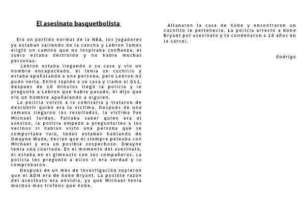 La policía volvió a la comisaría y trataron de descubrir quién era la víctima. Después de una semana llegaron los resultados, la víctima fue Michael Jordan. Faltaba saber quién era el asesino, la policía empezó a preguntarles a los vecinos si habían visto una persona que se comportaba raro, todos estaban hablando de Dwayne Wade, decían que él siempre peleaba con Michael y era un posible sospechoso. Dwayne tenía una coartada. En el momento del asesinato, él estaba en el gimnasio con sus compañeros. La policía les preguntó a ellos si era verdad y lo comprobaron.