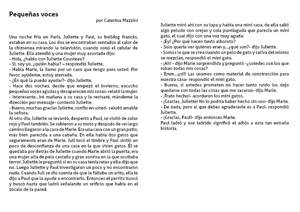Juliette miró ahí con su lupa y había una mini casa, de ella salió algo peludo con orejas y cola puntiaguda que parecía un mini gato, el cual dijo con una voz muy aguda: