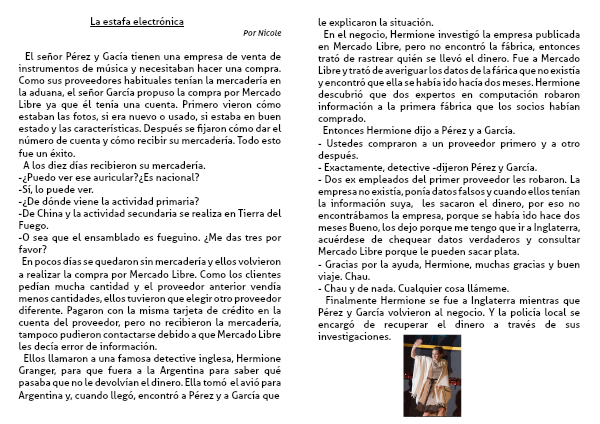 Ellos llamaron a una famosa detective inglesa, Hermione Granger, para que fuera a la Argentina para saber qué pasaba que no le devolvían el dinero. Ella tomó el avió para Argentina y, cuando llegó, encontró a Pérez y a García que