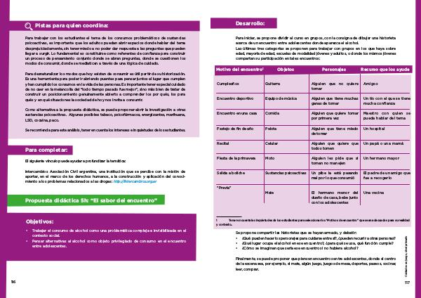 Para iniciar, se propone dividir al curso en grupos, con la consigna de dibujar una historieta acerca de un encuentro entre adolescentes donde aparezca el alcohol. Las últimas tres categorías se proponen para trabajar con grupos en los que haya sobre edad, mayoría de edad, escuelas de modalidad jóvenes y adultos, o donde los mismos jóvenes compartan su participación en tales encuentros: