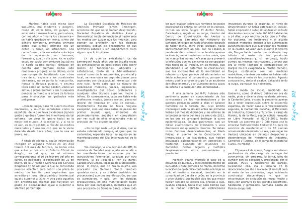 Marisol había sido mona ( por supuesto , era moderna y progre ), mona de estar bien , de guapa , de estar más o menos buena ; pero ahora , con los años ― frisaría los cincuenta ― se había quedado en mona , simio del género femenino , primate ; primate antes que simio : primate era un orden , y simio , un infraorden . Sea como fuere , cada vez estaba más lejos de la apariencia ser humana , femenina , que un día tuvo . Ya no sabía estar , no sabía comportarse ( quizá no lo había sabido nunca ; téngase en cuenta que siempre había sido moderna y progre ): en la oficina , en la que compartía habitáculo con otras tres de su especie y los ocasionales visitantes , no se ponía la mascarilla , nunca la llevaba puesta , y encima tosía como un perro ; perdón , como un simio , a pleno pulmón y sin ni siquiera ponerse la mano a la altura de la boca para interceptar las gotículas más peligrosas .