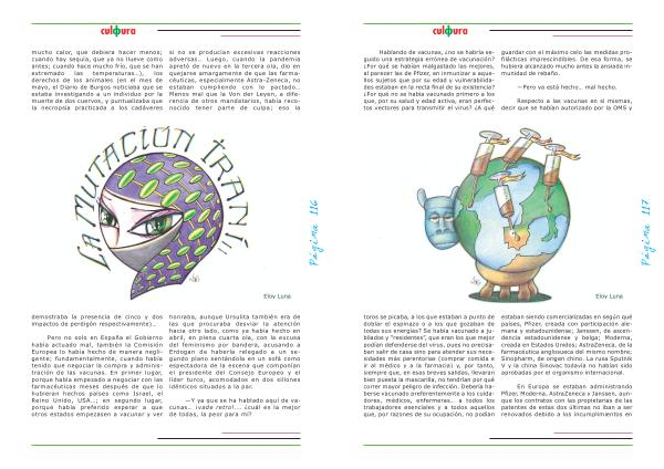 mucho calor , que debiera hacer menos ; cuando hay sequía , que ya no llueve como antes ; cuando hace mucho frío , que se han extremado las temperaturas …), los derechos de los animales ( en el mes de mayo , el Diario de Burgos noticiaba que se estaba investigando a un individuo por la muerte de dos cuervos , y puntualizaba que la necropsia practicada a los cadáveres si no se producían excesivas reacciones adversas … Luego , cuando la pandemia apretó de nuevo en la tercera ola , dio en quejarse amargamente de que las farmacéuticas , especialmente Astra-Zeneca , no estaban cumpliendo con lo pactado … Menos mal que la Von der Leyen , a diferencia de otros mandatarios , había reconocido tener parte de culpa ; eso la