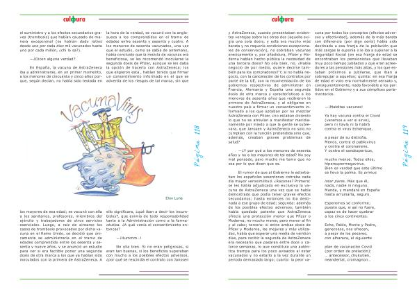 El rumor de que al Gobierno le estorbaban los españoles sesentones cobraba cada día mayor verosimilitud . ¿ Razones ? Primera : se les había adjudicado en exclusiva la vacuna de AstraZeneca una vez que se había demostrado que podía tener graves efectos secundarios ; hasta entonces no iba destinada a ese grupo de edad ; segunda : además de los posibles efectos adversos , también había quedado patente que AstraZeneca ofrecía una protección menor que Pfizer o Moderna ; no mucho menor , pero menor al fin y al cabo ; tercera : si entre ambas dosis de Pfizer y Moderna , las mejores y más utilizadas , había que esperar una media de veintiún días , para recibir la segunda de AstraZeneca era necesario que pasaran entre doce y catorce semanas , lo que constituía una auténtica trampa para los poco avisados al estar vacunados y no estarlo a la vez durante un periodo demasiado largo ; cuarto : la peor vacuna por todos los conceptos ( efectos adversos y efectividad ), además de la más barata con diferencia ( por algo sería ) había sido destinada a esa franja de la población que más cargas le suponía o le iba a suponer a la Seguridad Social ( en esa franja de edad se encontraban los pensionistas que llevaban muy poco tiempo jubilados y que eran acreedores a las pensiones más altas , y los que estaban próximos a jubilarse , que iban a sobrepujar a aquellos ; quinta : en esa franja de edad el voto era normalmente sensato y , consiguientemente , nada favorable a los partidos en el Gobierno y a sus cómplices parlamentarios .