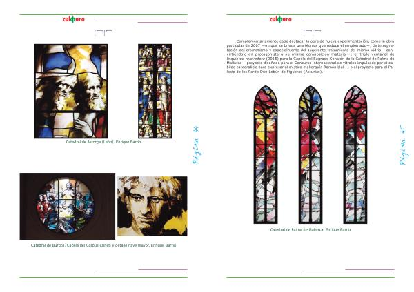 Complementariamente cabe destacar la obra de nueva experimentación , como la obra particular de 2007 ― en que se brinda una técnica que reduce el emplomado ―, de interpretación del cromatismo y especialmente del sugerente tratamiento del mismo vidrio ― convirtiéndolo en protagonista a su misma composición material ―; el triple ventanal de Inquietud relevadora ( 2015 ) para la Capilla del Sagrado Corazón de la Catedral de Palma de Mallorca ― proyecto diseñado para el Concurso internacional de vitrales impulsado por el cabildo catedralicio para expresar al místico mallorquín Ramón Llul ―; o el proyecto para el Palacio de los Pardo Don Lebún de Figueras ( Asturias ).