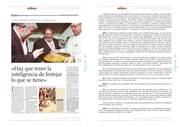 JUAN MONS , 1989 nos del oficio con un cierto retraso . ¿ Autodidacta ? Nadie puede decir que no viene de los demás , pero nunca copio , ni siquiera del natural : veoloqueexiste , vivoentre ello , lo metabolizo y luego lo plasmo a mi leal saber y entender .