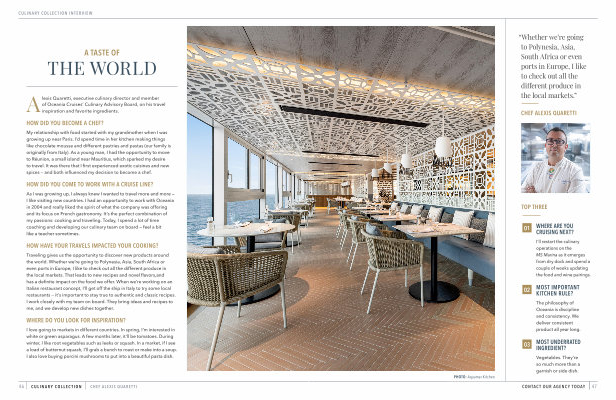 Alexis Quaretti , executive culinary director and member of Oceania Cruises ’ Culinary Advisory Board , on his travel inspiration and favorite ingredients .