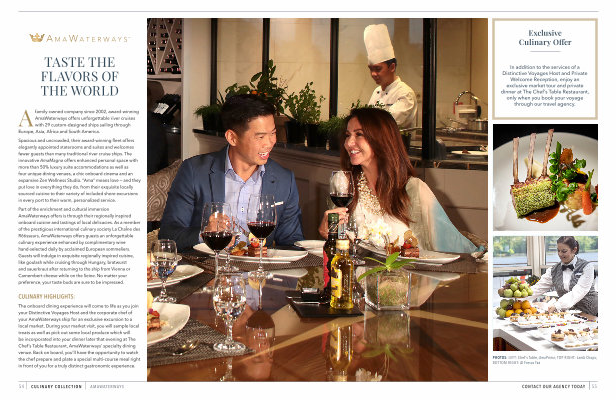 In addition to the services of a Distinctive Voyages Host and Private Welcome Reception , enjoy an exclusive market tour and private dinner at The Chef ’ s Table Restaurant , only when you book your voyage through our travel agency .