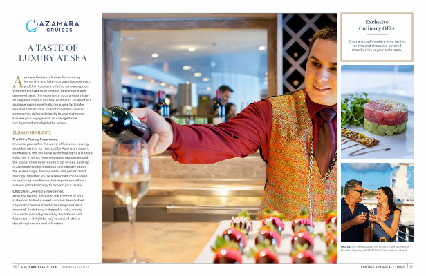 Azamara Cruises is known for creating immersive and luxurious travel experiences , and this indulgent offering is no exception . Whether enjoyed as a romantic gesture or a welldeserved treat , this experience adds an extra layer of elegance to your journey . Azamara Cruises offers a unique experience featuring a wine tasting for two and a delectable treat of chocolate-covered strawberries delivered directly to your stateroom . Elevate your voyage with an unforgettable indulgence that delights the senses .