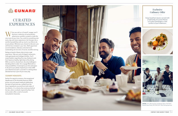 When you sail on a Cunard ® voyage , you ’ ll discover a selection of extraordinary adventures carefully curated to make the very most of your time . You could try something new every day and never experience it all . Escape into a world of possibilities with as much or as little to do as you please . Wherever you choose to discover , you will find lots included in your fare . Well-appointed accommodations , fabulous entertainment , outstanding service and , of course , excellent dining .