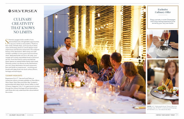 Experience S . A . L . T . ™ , Sea and Land Taste , an immersive culinary concept available on Silver Moon , Silver Dawn , Silver Nova and Silver Ray . Curated in partnership with Adam Sachs , former editor in chief of Saveur magazine , S . A . L . T . is a gastronomic journey through the culinary heritage of local destinations with those who truly understand the culture behind the cuisine .