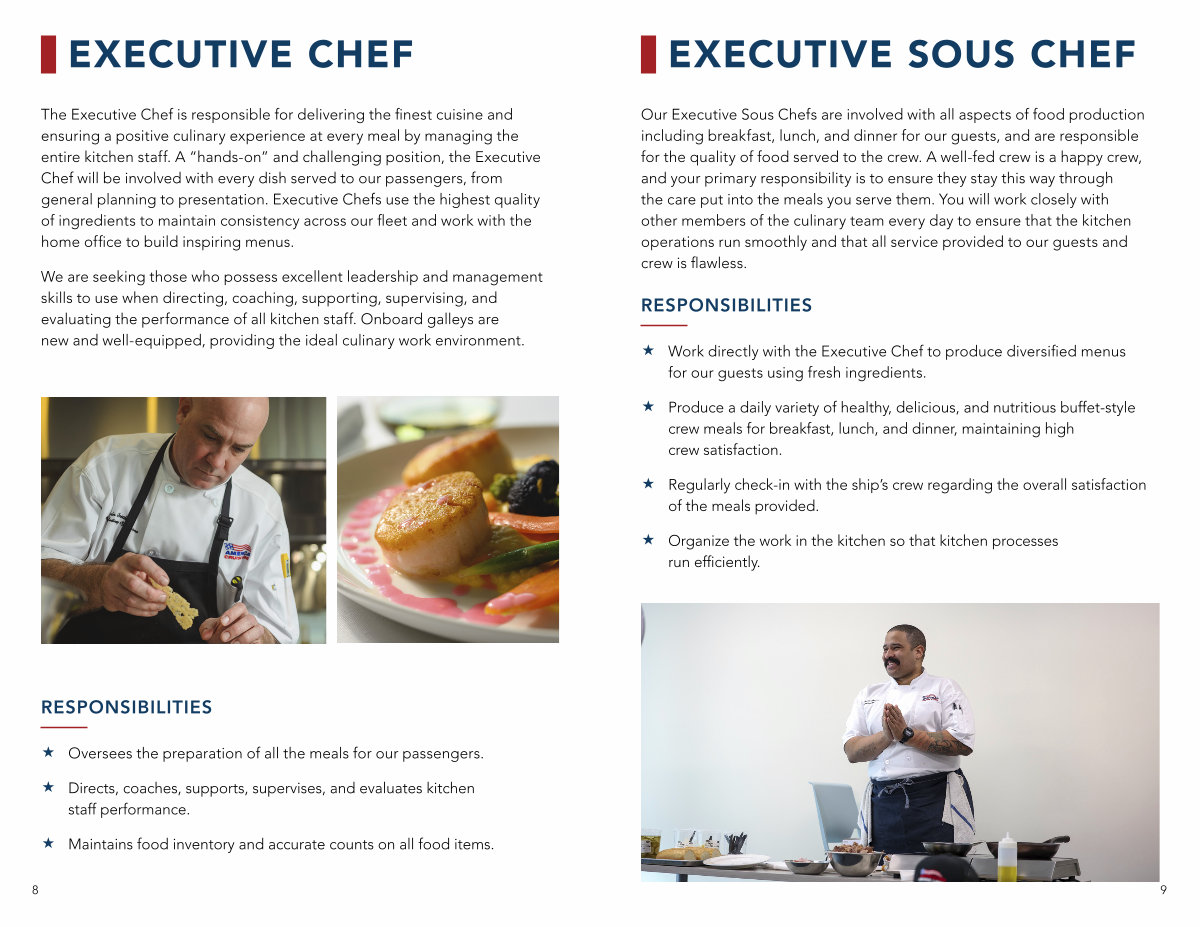 The Executive Chef is responsible for delivering the finest cuisine and ensuring a positive culinary experience at every meal by managing the entire kitchen staff . A “ hands-on ” and challenging position , the Executive Chef will be involved with every dish served to our passengers , from general planning to presentation . Executive Chefs use the highest quality of ingredients to maintain consistency across our fleet and work with the home office to build inspiring menus .