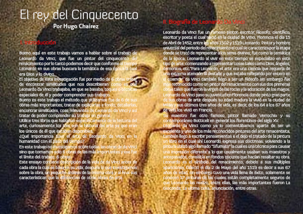 Leonardo da Vinci fue un famoso pintor, escritor, filosofo, científico, escritor y poeta el cual nació en la ciudad de Vinci, Florencia el día 15 de Abril de 1452, entre los años 1502 y 1519 Leonardo. Pintor y hombre universal del periodo del renacimiento el cual se caracteriza por la etapa donde se trató de representar a los seres divinos, fue como la temática de la época, Leonardo al vivir en este tiempo se especializo en este tipo de arte, comenzando a representar cosas tales como Dios, ángeles, demonios, etc.“Para Leonardo, el arte era una ciencia que requería de una extrema atención al destalle y que estaba reflejando por entero en el cosmos” da Vinci también llego a ser un filósofo sin embargo fue más reconocido como un pintor del renacimiento con sus dos primeras obras tales que fueron la virgen de las rocas y la adoración de los magos.