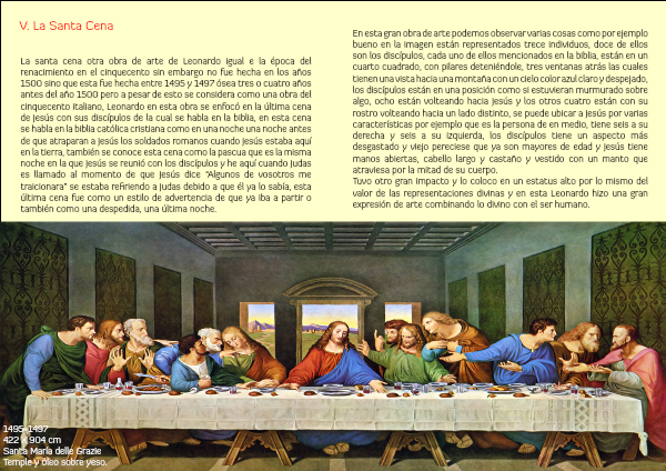 La santa cena otra obra de arte de Leonardo igual e la época del renacimiento en el cinquecento sin embargo no fue hecha en los años 1500 sino que esta fue hecha entre 1495 y 1497 ósea tres o cuatro años antes del año 1500 pero a pesar de esto se considera como una obra del cinquecento italiano, Leonardo en esta obra se enfocó en la última cena de Jesús con sus discípulos de la cual se habla en la biblia, en esta cena se habla en la biblia católica cristiana como en una noche una noche antes de que atraparan a Jesús los soldados romanos cuando Jesús estaba aquí en la tierra, también se conoce esta cena como la pascua que es la misma