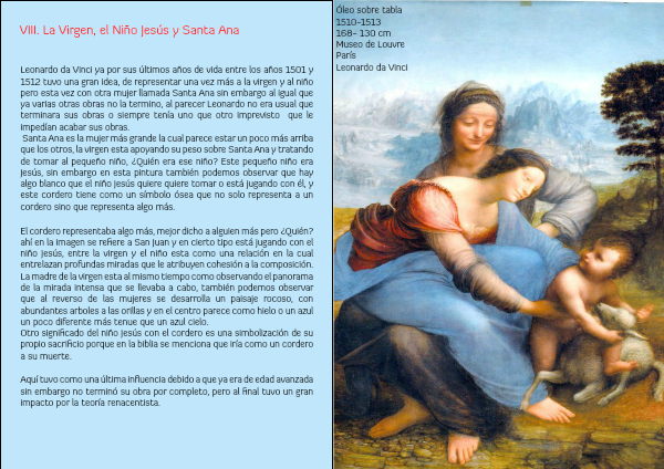 Santa Ana es la mujer más grande la cual parece estar un poco más arriba que los otros, la virgen esta apoyando su peso sobre Santa Ana y tratando de tomar al pequeño niño, ¿Quién era ese niño? Este pequeño niño era Jesús, sin embargo en esta pintura también podemos observar que hay algo blanco que el niño Jesús quiere quiere tomar o está jugando con él, y este cordero tiene como un símbolo ósea que no solo representa a un cordero sino que representa algo más.
