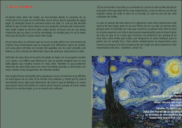 Al pintar esta obra van Gogh, se encontraba desde la ventana de un manicomio en el que se encontraba, era lo único que le gustaba de aquel lugar. El volteaba hacia la ventana todos los días, lo cual un día decidió pintar lo que él veía hacia afuera en esa pequeña ventana del manicomio. Van Gogh realizó la técnica Óleo sobre lienzo al hacer una de sus obras maestras que es esta La noche estrellada, en verdad para mi es la mejor obra que ha hecho el gran autor Van Gogh.
