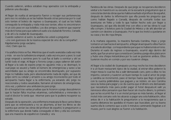 Y la azafata triste se fue. Mientras que el vuelo avanzaba cada vez más y más en eso la turbulencia empezó, cada vez era peor y peor, lo cual Jorge empezó a sentirse pero lo cual fue al baño a vomitar y ahí se tardó todo el viaje. Al llegar a Toronto Jorge y pepe salieron del avión al llegar a la sala de espera Jorge no aguanto más y se desmayó, lo cual pepe se asustó y hablo al número de emergencias y aviso a las autoridades que su amigo se encontraba desmayado, por supuesto Pepe no hablaba nada, pero absolutamente nada de inglés, así que de golpe cerro su celular y arrastro a su amigo inconsciente por todo el aeropuerto hasta llegar a la enfermería, ya estando ahí, Jorge no reaccionaba y todos asustados, llamaron al número de emergencias, otra vez, y pidieron una ambulancia para Jorge.