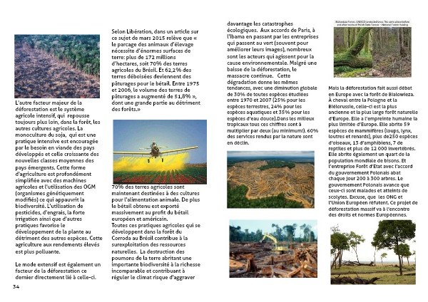 L'autre facteur majeur de la déforestation est le système agricole intensif, qui repousse toujours plus loin, dans la forêt, les autres cultures agricoles. La monoculture du soja, qui est une pratique intensive est encouragée par le besoin en viande des pays développés et celle croissante des nouvelles classes moyennes des pays émergents. Cette forme d'agriculture est profondément simplifiée avec des machines agricoles et l'utilisation des OGM (organismes génétiquement modifiés) ce qui appauvrit la biodiversité. L'utilisation de pesticides, d'engrais, la forte irrigation ainsi que d'autres pratiques favorise le développement de la plante au détriment des autres espèces. Cette agriculture aux rendements élevés est plus polluante.