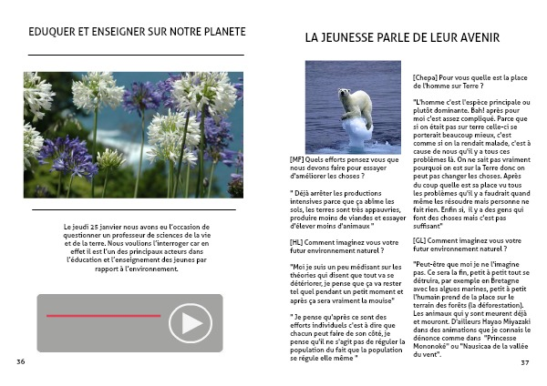 "Peut-être que moi je ne l'imagine pas. Ce sera la fin, petit à petit tout se détruira, par exemple en Bretagne avec les algues marines, petit à petit l'humain prend de la place sur le terrain des forêts (la déforestation). Les animaux qui y sont meurent déjà et mouront. D'ailleurs Hayao Miyazaki dans des animations que je connais le dénonce comme dans "Princesse Mononoké'' ou "Nausicaa de la vallée du vent".