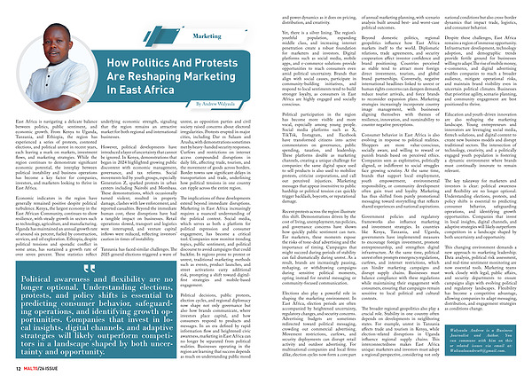 Despite these challenges, East Africa remains a region of immense opportunity. Infrastructure development, technology adoption, and demographic trends provide fertile ground for businesses willing to adapt. The rise of mobile money, e-commerce, and digital advertising enables companies to reach a broader audience, mitigate operational risks, and maintain brand visibility even in uncertain political climates. Businesses that prioritize agility, scenario planning, and community engagement are best positioned to thrive.