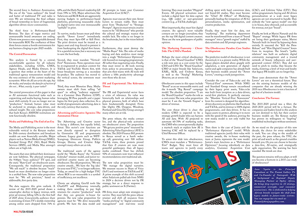 The traditional assets of the agency world the " Media Buyer," the " Content Calendar " retainer model, and junior-tomid-level creative teams are becoming obsolescent. The old proposition, " We win creative awards... We have the ' big idea ' for your next TVC," is no longer sufficient. Today, an award for a high-budget TVC whose ROI is un-measurable is a symbol of inefficiency, not excellence.