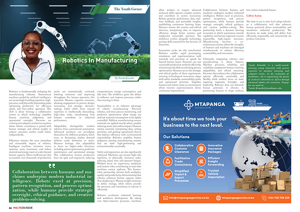 Robotics is fundamentally reshaping the manufacturing industry. Autonomous machines guided by artificial intelligence are increasingly handling repetitive, highprecision, and physically demanding tasks, optimizing production for efficiency, speed, and low-carbon operation. This shift is about forming a collaborative system in which technology amplifies human creativity, judgement, and operational oversight. Factories are evolving into adaptive, resilient ecosystems where robotic consistency is paired with human strategic and ethical insight to achieve outcomes neither could realize independently.