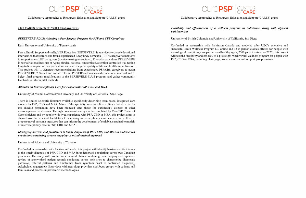 There is limited scientific literature available specifically describing team-based, integrated care models for PSP, CBD and MSA. Many of the specialty interdisciplinary clinics that do exist for this disease population have been modeled after those for Parkinson’ s disease or other neurodegenerative diseases. Through concurrent surveys to be completed by CurePSP Center of Care clinicians and by people with lived experience with PSP, CBD or MSA, this project aims to characterize barriers and facilitators to accessing interdisciplinary care services as well as to propose novel outcome measures that can inform the development of scalable, sustainable models of interdisciplinary care in PSP, CBD and MSA.
