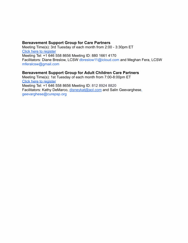 Bereavement Support Group for Adult Children Care Partners Meeting Time( s): 1st Tuesday of each month from 7:00-8:00pm ET Click here to register Meeting Tel: + 1 646 558 8656 Meeting ID: 812 8924 8820 Facilitators: Kathy DeMarco, disneykat @ aol. com and Salin Geevarghese, geevarghese @ curepsp. org