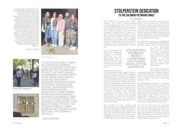 “ I ’ D LIKE TO SINCERELY THANK THE AMERICAN WOMEN ’ S CLUB OF HAMBURG FOR THEIR WORK ON THE STOLPERSTEIN PROJECT AND THE PLAQUES IN HAMBURG NOW DEDICATED TO MY GREAT-GREAT AUNTS — LEA , ROSA , AND FANNY SOLOMON . WALKING IN THEIR FOOTSTEPS , VISITING THEIR HISTORIC NEIGHBORHOODS , AND STANDING IN THE SHADOWS OF THEIR FORMER HOMES WAS AN INCREDIBLY POWERFUL EXPERIENCE , ONE I WILL NOT SOON FORGET . THIS EXPERIENCE WOULD NOT HAVE BEEN POSSIBLE WITHOUT THE INTREPID WORK OF CAROL HARBERS AND THE AWCH , AND , FOR THAT , I AM ETERNALLY GRATEFUL .”