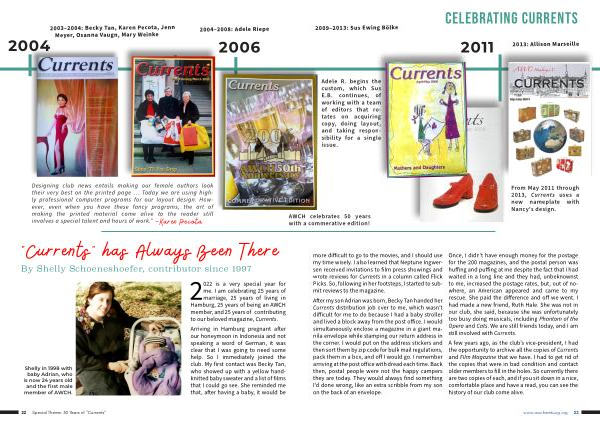 2022 is a very special year for me . I am celebrating 25 years of marriage , 25 years of living in Hamburg , 25 years of being an AWCH member , and 25 years of contributing to our beloved magazine , Currents .