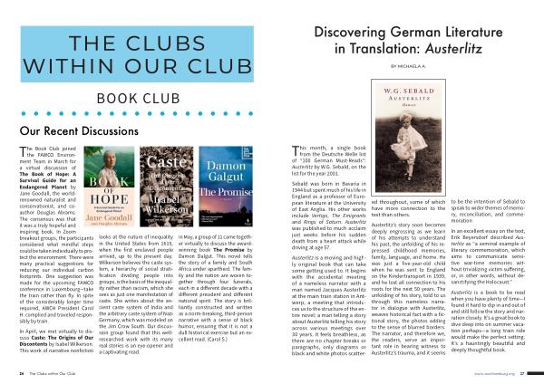 The Book Club joined the FAWCO Environment Team in March for a virtual discussion of The Book of Hope : A Survival Guide for an Endangered Planet by Jane Goodall , the worldrenowned naturalist and conservationist , and coauthor Douglas Abrams . The consensus was that it was a truly hopeful and inspiring book . In Zoom breakout groups , the participants considered what mindful steps could be taken individually to protect the environment . There were many practical suggestions for reducing our individual carbon footprints . One suggestion was made for the upcoming FAWCO conference in Luxembourg — take the train rather than fly . In spite of the considerably longer time required , AWCH President Carol H . complied and traveled responsibly by train .