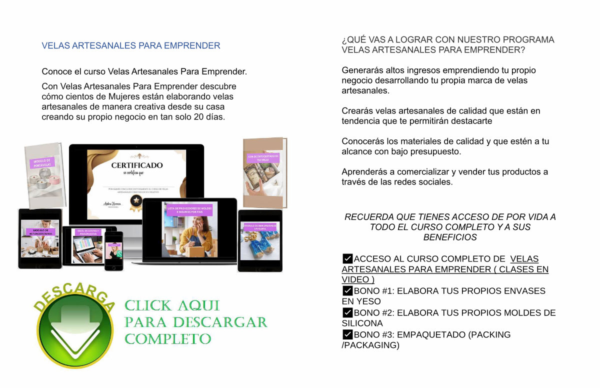 ✅ACCESO AL CURSO COMPLETO DE VELAS ARTESANALES PARA EMPRENDER( CLASES EN VIDEO) ✅BONO # 1: ELABORA TUS PROPIOS ENVASES EN YESO ✅BONO # 2: ELABORA TUS PROPIOS MOLDES DE SILICONA ✅BONO # 3: EMPAQUETADO( PACKING / PACKAGING)