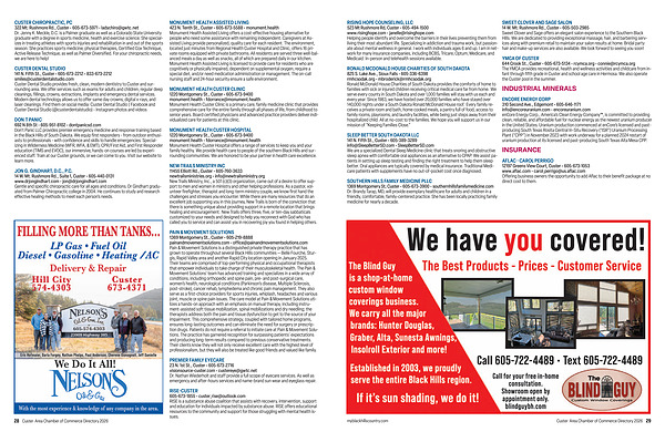 CUSTER DENTAL STUDIO 141 N. Fifth St., Custer • 605-673-2212 • 833-673-2212 smiles @ custerdentalstudio. com Custer Dental Studio provides fresh, clean, modern dentistry to Custer and surrounding area. We offer services such as exams for adults and children, regular deep cleanings, fillings, crowns, extractions, implants and emergency dental services. Modern dental technology allows us to offer same day crowns, digital x-rays, and laser cleanings. Find them on social media: Custer Dental Studio | Facebook and Custer Dental Studio(@ custerdentalstudio) • Instagram photos and videos