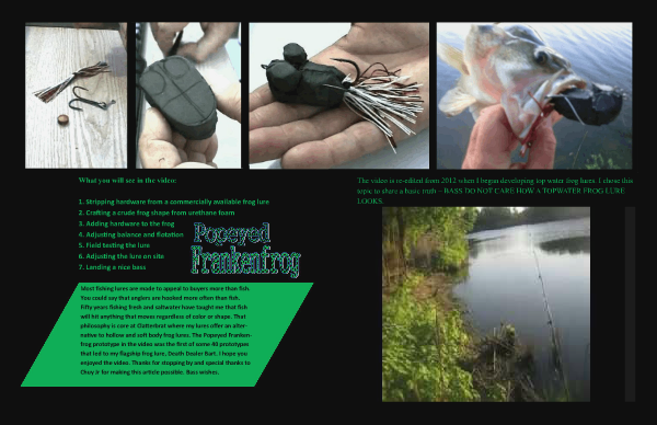 philosophy is core at Clatterbrat where my lures offer an alternative to hollow and soft body frog lures. The Popeyed Frankenfrog prototype in the video was the first of some 40 prototypes