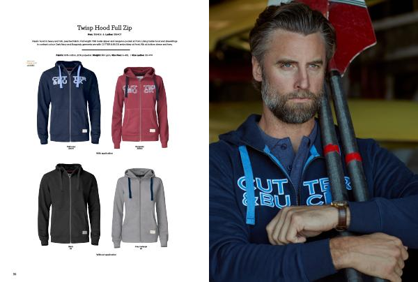Classic hood in heavy and rich , peached fabric . Full length YKK metal zipper and cangaroo pocket at front . Lining inside hood and drawstrings in contrast colour . Dark Navy and Burgundy garments are with CUTTER & BUCK embroidery at front . Rib at bottom sleeve and hem .