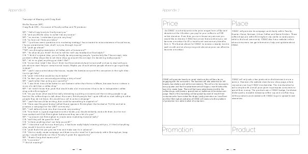 MP:“ Hello Craig lovely to finally meet you” CB:“ and you Mollie sorry it couldn’ t be any sooner” MP:“ no worries, I understand you are very busy” CB:“ so how can I help you today” MP:“ I just have some questions on a marketing strategy I have created to raise awareness of social issues, I have a presentation here, shall I run you through it quick” CB:“ yeah go ahead” ** MP runs through presentation of Coffee with a Conscience ** MP:“ So what do you think? It’ s fine to tell the truth any feedback will be helpful” CB:“ I think it’ s a great idea, you will really be empowering people, I particularly like Fika concept, independent coffee shops like to set there shop up around this concept it is becoming really popular.” MP:“ oh im so glad, anything you didn’ t like?” CB:“ its not that I didn’ t like it but I think it will be extremely hard to train staff on how to deal with people who are want help on certain social issues. Maybe you should advice people where to go to get help instead.” MP:“ yeah I was worried about that issues, maybe the baristas can point the consumers in the right direction to get help” CB:“ yeah I think that would be much better” CB:“ as then you are consciously providing a duty of care” MP:“ yeah rather than acting as a councillor” CB:“ I also think it would be better to use Kanteen rather than Home is Where, because home is where is more of a deli than a coffee shop” MP:“ oh I didn’ t know that, yeah that would make a lot more sense it has to be in independent coffee shop within Birmingham” CB:“ do you know what would be really interesting is putting on events and then inviting people to go back to the coffee shops to talk about the event, British people find I quite difficult to start talking to other people they do not know, this would be a call to action campaign” MP:“ yeah that would be exciting, that could be something to expand on” CB:“ there was this great festival called Queer spaces in Birmingham that looked at TV, film and art to produce a campaign for the LGBT community” MP:“ I will defiantly look into that it sounds very exciting” CB:“ love brum is a great organisation and a funder, you should defiantly work with them, but for me I have worked with Visit Birmingham before and they are a bit of a pain” MP:“ I just want visit Birmingham to create extra marketing material really” CB:“ well they will be good for that” CB:“ is there anything else I can help you with?” MP:“ I think that is all for now, thank you, it has been really helpful meeting with you, if I think of anything else, would it be ok to email you?” CB:“ yeah that’ s fine just give me time and make sure its in advance” CB:“ this is a really create campaign and there is such a need for it particularly within Birmingham, keep going, I would defiantly run this in Faculty if given the opportunity” MP:“ thanks Craig that means a lot” CB:“ no worries” ** End of meeting **