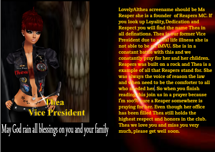 LovelyAlthea screename should be Ms Reaper she is a founder of Reapers MC. If you look up Loyality, Dedication and Respect you will find the name Thea in all definations. Thea is our former Vice President due to a real life illness she is not able to be on IMVU. She is in a constant battle with this and we constantly pray for her and her children. Reapers was built on a rock and Thea is a example of all that Reapers stand for. She was always the voice of reason the law and when need to be the comforter to all who needed her. So when you finish reading this join us in a prayer because I'm 100% sure a Reaper somewhere is praying for her. Even though her office has been filled Thea still holds the highest respect and honors in the club.