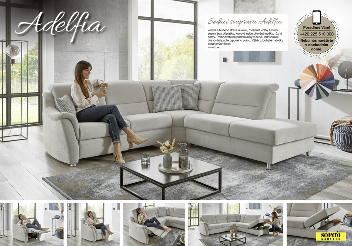 kostra z tvrdého dřeva a kovu, možnost volby tuhosti sezení bez příplatku, kovové nebo dřevěné nožky, různé barvy. Polohovatelné podhlavníky v ceně. Individuální plánování podle typového plánu. Výběr z bohaté nabídky potahových látek.