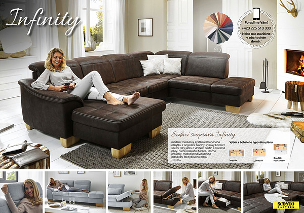 moderní modulový systém čalouněného nábytku z originální tkaniny, vysoký komfort sezení díky jádru z vlnitých pružin a studené pěny, různé relaxační funkce, úložné prostory, možnost individuálního plánování dle typového plánu
