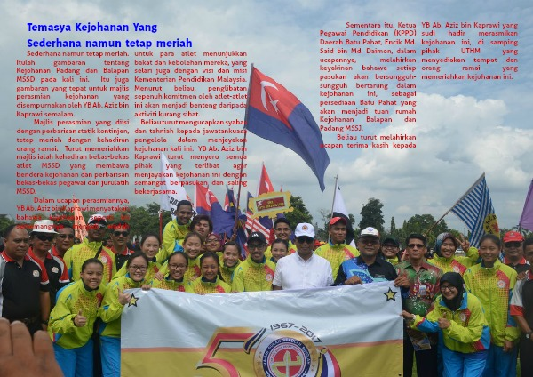 Sederhana namun tetap meriah. Itulah gambaran tentang Kejohanan Padang dan Balapan MSSD pada kali ini. Itu juga gambaran yang tepat untuk majlis perasmian kejohanan yang disempurnakan oleh YB Ab. Aziz bin Kaprawi semalam.