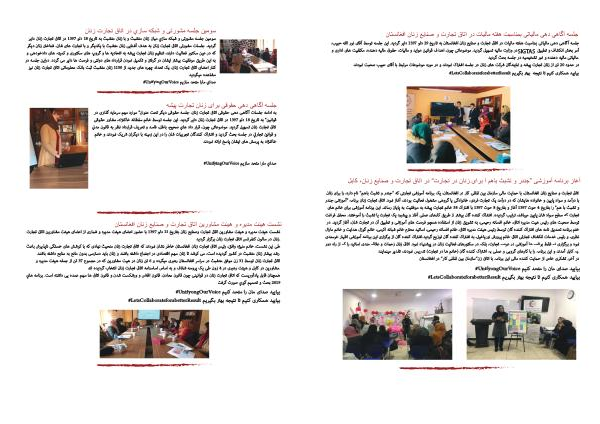 گردید . جلسات مشورتی اتاق تجارت زنان به هدف آشنایی زنان متشبث با یکدیگر و با تجارت های شان ، شناخنت زنان دیگر که در عین سکتور فعالیت دارند ، تنظیم زنان تجارت پیشه به اتحادیه ها و گروپ ھای سکتوری و کمیتہ های دادخودهی و به این طریق موفقیت بیشتر ایشان در گرفنت و تکمیل منودن قرارداد های دولتی و فرصت ھا دایر می گردد . دراین جلسه در کنار اعضای اتاق تجارت زنان ، یک تعداد چهره های جدید از 1150 زنان متشبث ثبت بانک معلوماتی اتاق تجارت زنان نیز مشاهده میگردید صداي مارا متحد سازيم # UnifyingOurVoice