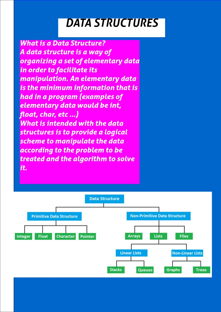 A data structure is a way of organizing a set of elementary data in order to facilitate its manipulation. An elementary data is the minimum information that is had in a program (examples of elementary data would be int, float, char, etc ...)
