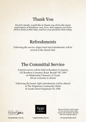 Music and literary works copied for this service are done under license with OneMusic Australia , ARIA and Copyright Agency funeralstudio . com . au kingsfunerals . com . au © Funeral Studio 2025