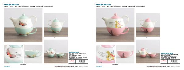 Ceramic | 6”w x 5.3”h x 4.25”d | Teapot sits inside tea cup | Dishwasher & microwave safe | White box packaging