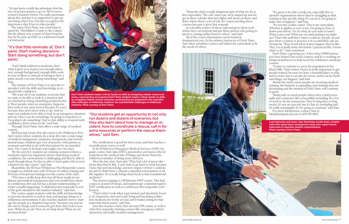 Lead instructor and owner, Sam Smolnisky, breaks down complex topics like spinal injury management using clear, expert-driven instruction to maximize student comprehension. Photo courtesy of Don’ t Panic myblackshillscountry. com Down Country Roads