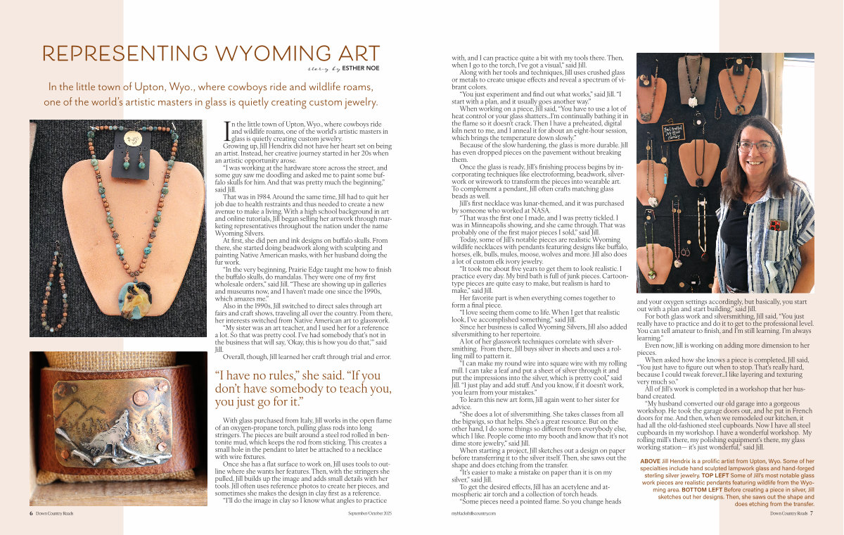 That was in 1984. Around the same time, Jill had to quit her job due to health restraints and thu s needed to create a new avenue to make a living. With a high school background in art and online tutorials, Jill began selling her artwork through marketing representatives throughout the nation under the name Wyoming Silvers.